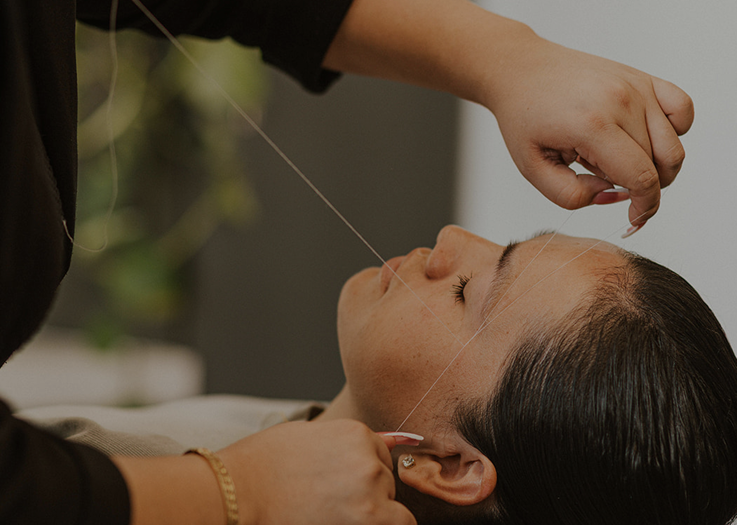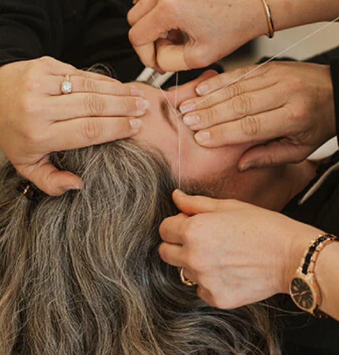 Precise brow shaping using cotton thread to define your natural structure with care.